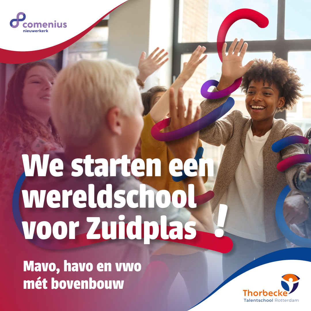 Comenius Nieuwerkerk en Thorbecke Talentschool Nieuwerkerk gaan er samen voor: een nieuwe school in de gemeente Zuidplas waar leerlingen de mavo, havo en vwo kunnen volgen.